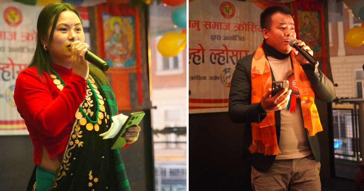 तमु ल्होसारको अवसरमा आफ्नो गायन प्रस्तुति पस्कदै गायिका शर्मिला गुरुङ्ग (बायाँ) र गायक अशोक राई (दायाँ)